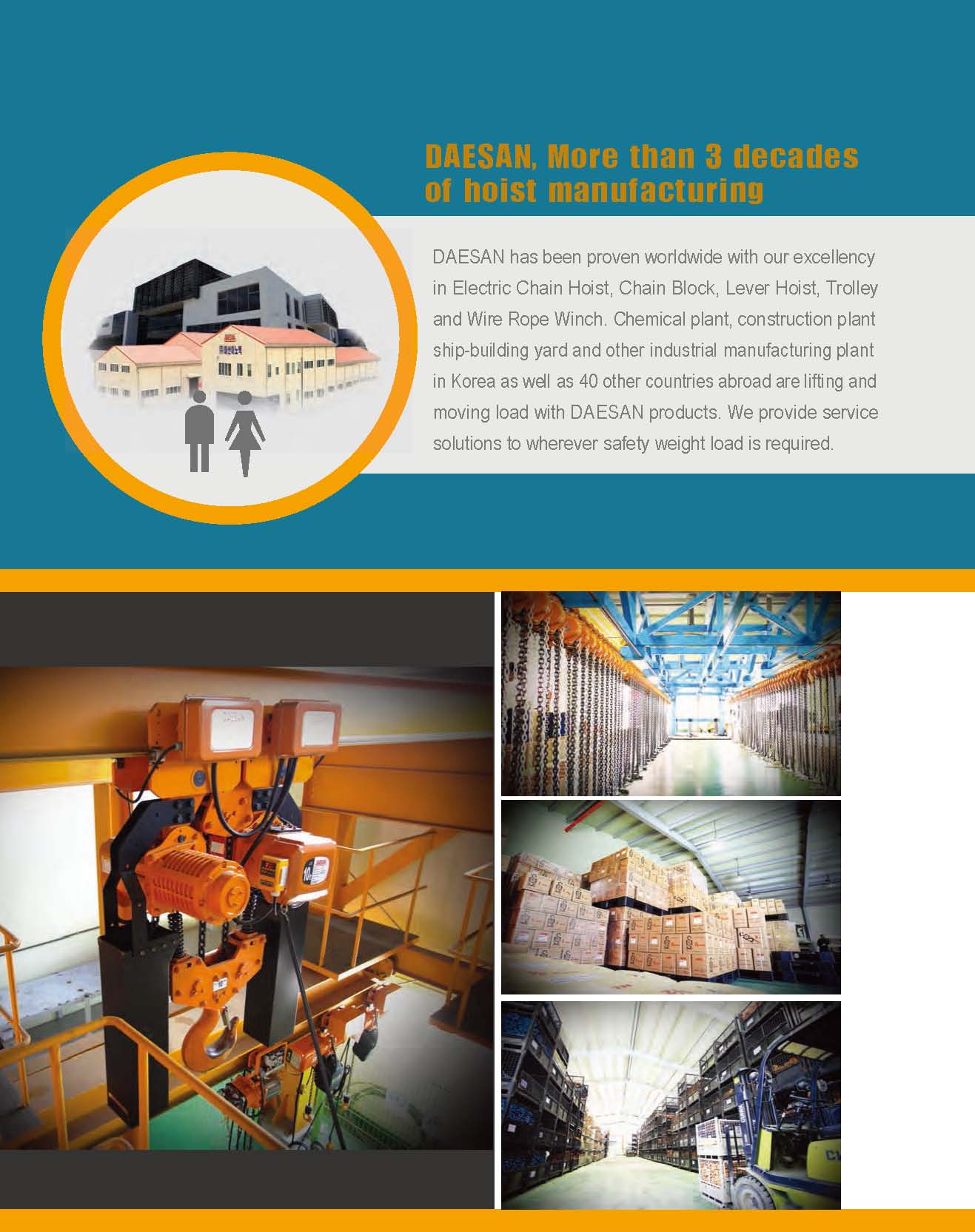 DAESAN株式會社先進的生產技術和設備,通過國內以及國外40多個國家和的確的經銷網絡,提供高品質安全的起重作業(yè)產品。產品廣泛應用于煉油廠、造船廠、建筑工地、發(fā)電廠、海洋石油平臺及各種現(xiàn)代化的生產流水線和裝配線。