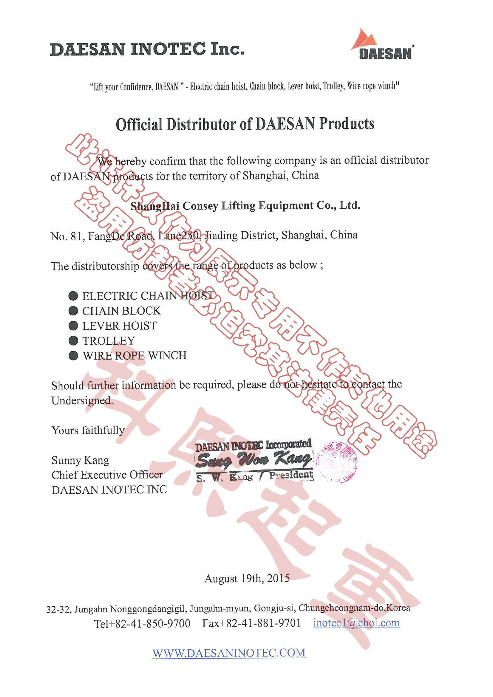 DAESAN大山INOTEC是一家專業(yè)生產(chǎn)物料起重搬運產(chǎn)品 - 環(huán)鏈電動葫蘆,手拉葫蘆,手扳葫蘆,手動單軌小車,鋼絲繩絞盤等相關(guān)起重設(shè)備制造商,并為客戶做服務(wù)解決方案。