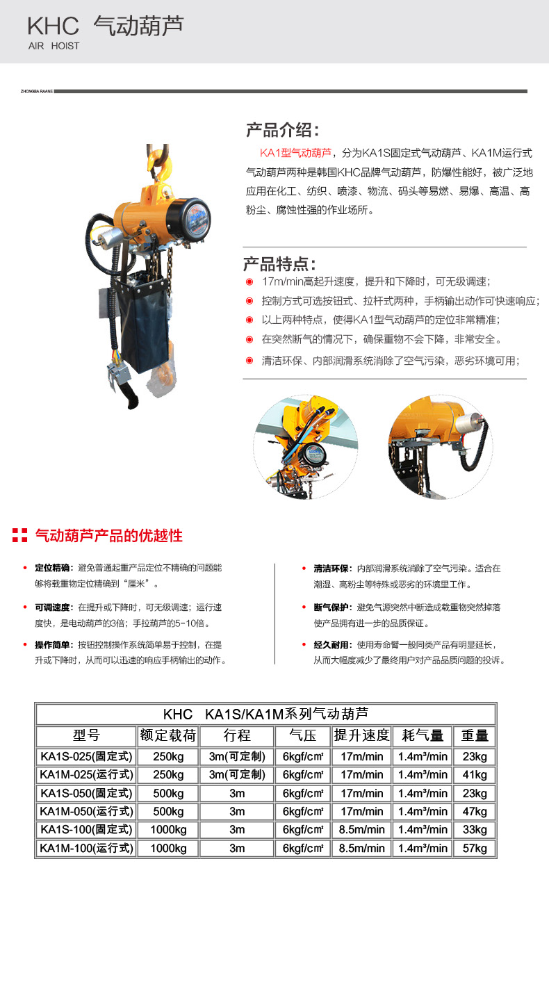 【KHC氣動葫蘆的工作原理】 KHC氣動葫蘆通過特殊設(shè)備進行氣體壓縮,產(chǎn)生動力轉(zhuǎn)化成機械能,進而達到起吊貨物的目的。