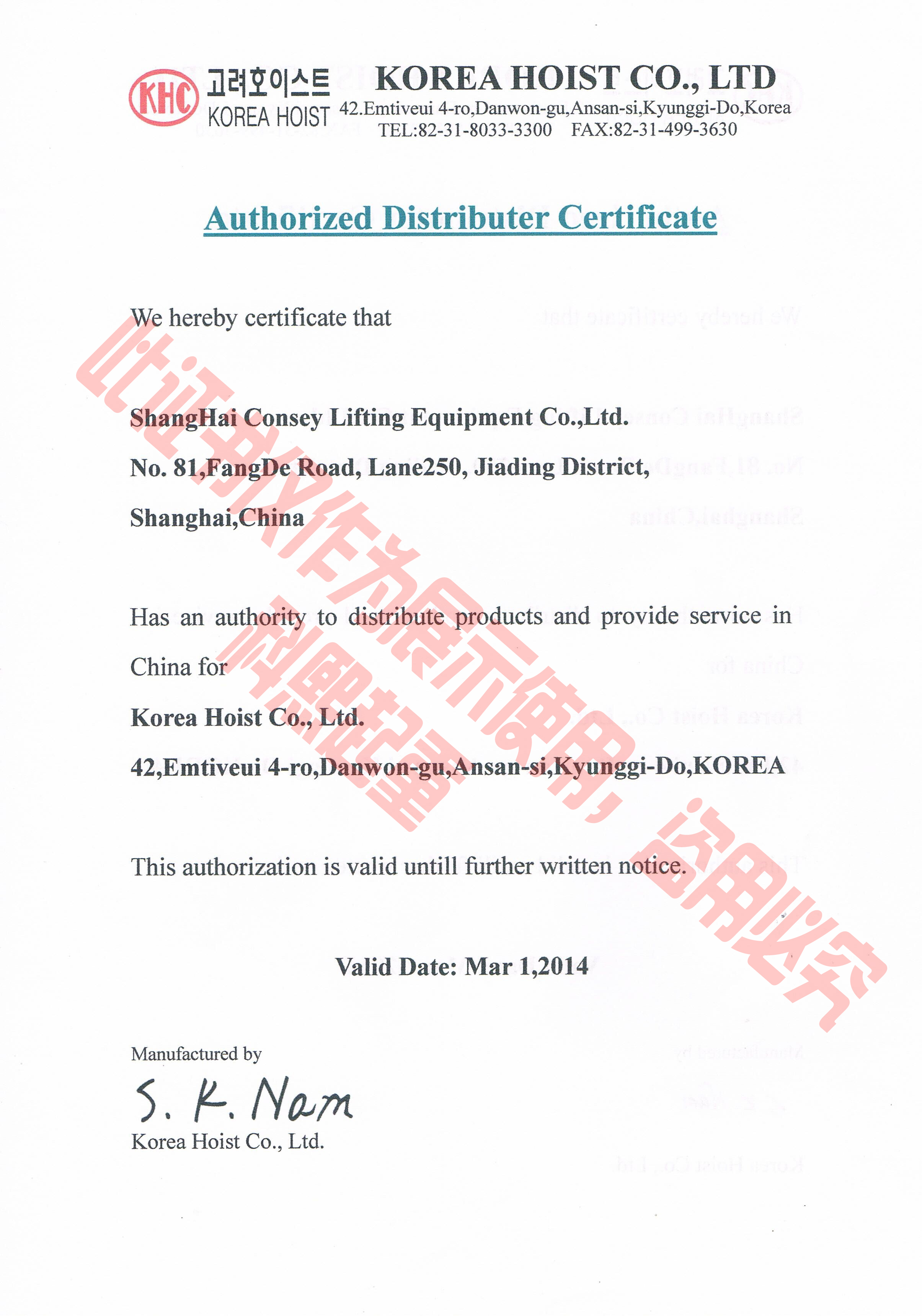 韓國(guó)KHC株式會(huì)社(氣動(dòng)葫蘆代理授權(quán)書展示)
